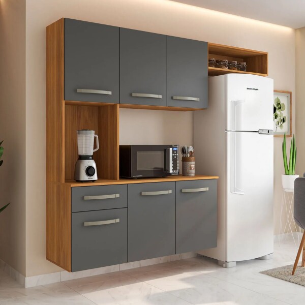 Armário de Cozinha Completa Suspenso com Balcão 6 Portas 1 Gaveta Belíssima Freijó/Grafite Fiorello