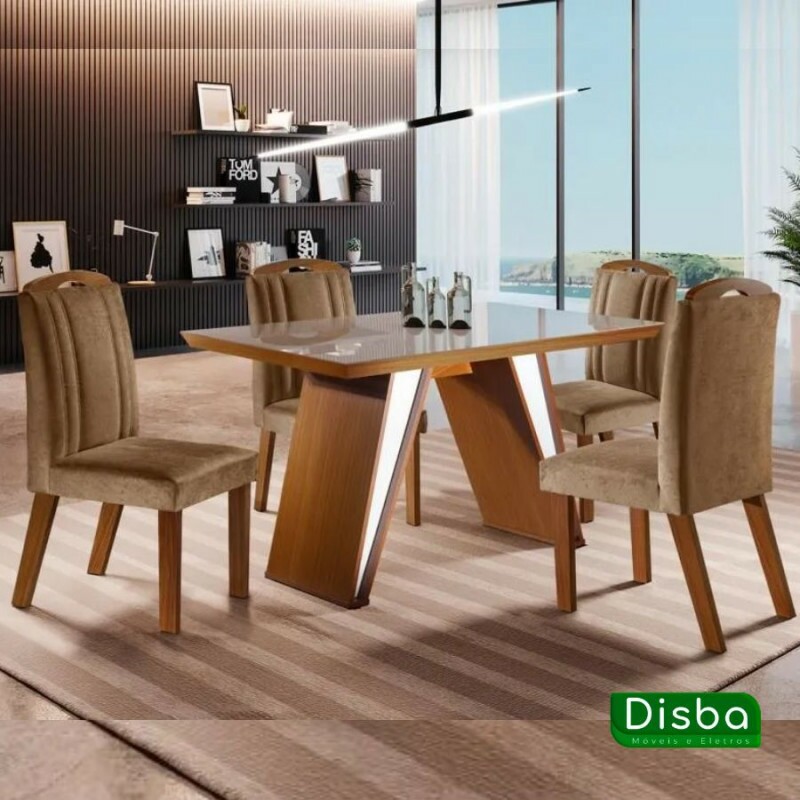 Conj. Mesa Florença 135x90cm, Castanho/ Cinamomo. c/ 4 cadeiras Suedy/Creme - Lj Moveis