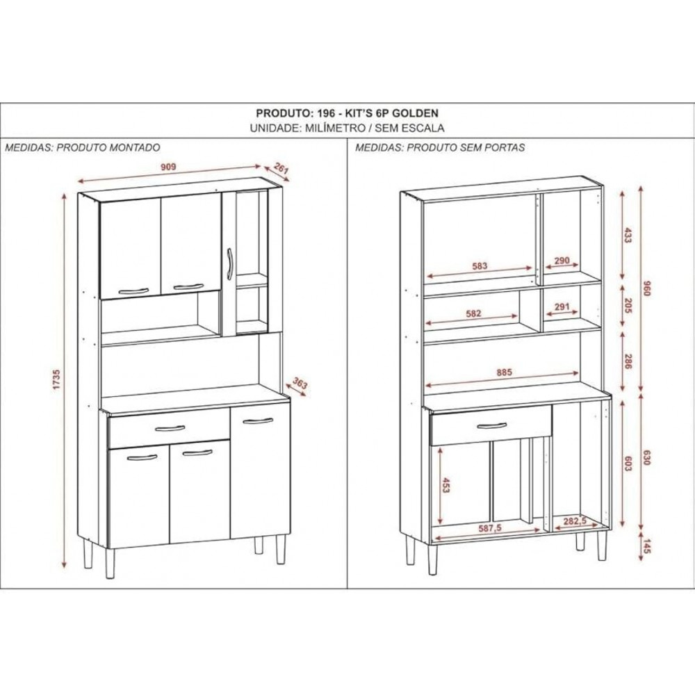 • 6 Portas - sendo uma porta superior com vidro, Dobradiças e corrediças metálicas,